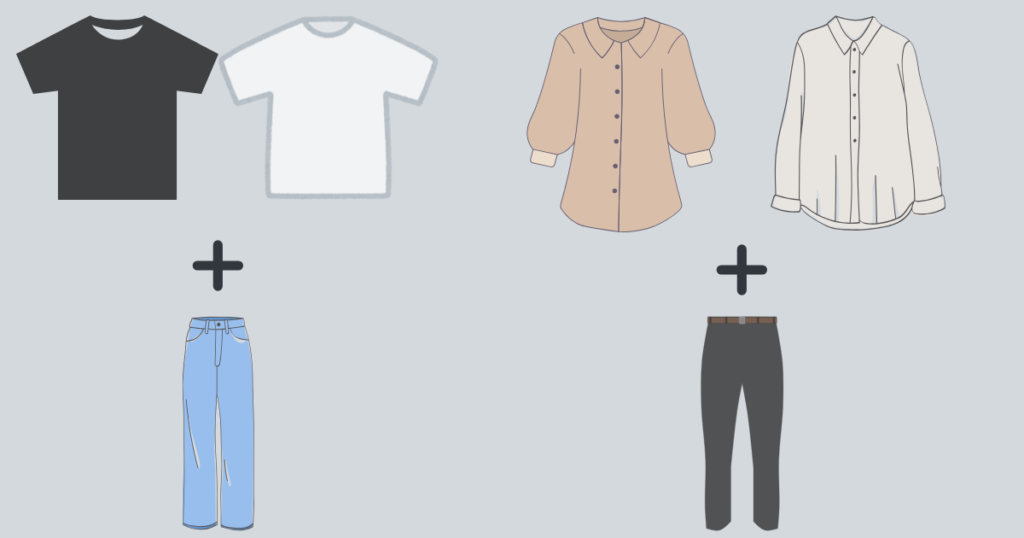 私服の制服化」とは、毎日の服選びをシンプルにするために、定番スタイルを決めて着回すことです。学校や会社の制服のように「これを着る」と決め、“迷わない仕組み”にすることから「制服化」と呼ばれています。
